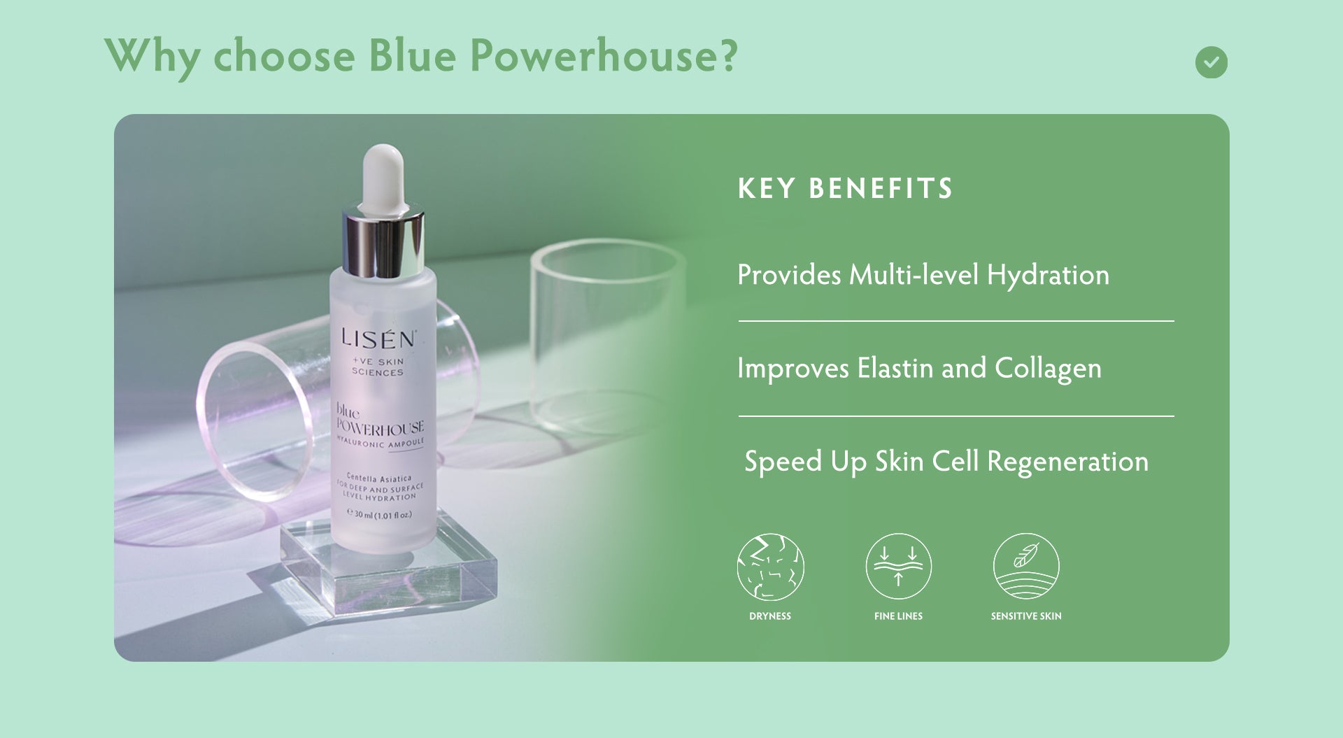 - Blue Powerhouse is the most advanced form of hyaluronic acid, a water-soluble salt form of the acid with three different molecular sizes for intense multi-level hydration.